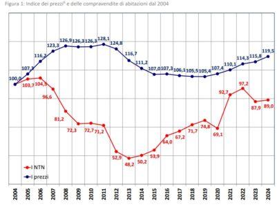 Dal lato dei prezzi, si registra un rialzo del 3,2% nel 2024, in continuità con il trend positivo avviato nel 2020, a fronte di una stagnazione prolungata tra il 2012 e il 2019. Il valore medio degli immobili continua così a recuperare terreno, anche se con dinamiche diverse rispetto al numero di compravendite.