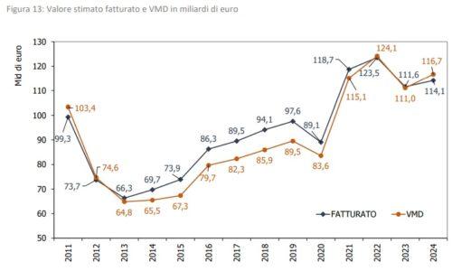 Il Valore Monetario Dichiarato (VMD) con riferimento agli atti di compravendita stipulati nel 2024 rappresenta anch’esso una stima della reale entità monetaria dichiarata per l’acquisto di immobili residenziali. Se da un lato il valore del “fatturato” riguarda le sole abitazioni ed è stimato con una quotazione media per tutti gli immobili in un comune, senza quindi tener conto di fattori posizionali né della vetustà né dello stato di conservazione