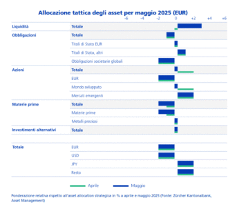 L’introduzione di dazi draconiani sulle importazioni statunitensi ha inizialmente fatto crollare i mercati azionari e il dollaro Usa. Dopo la proroga, i mercati hanno ripreso a salire. Ora ci si chiede se ci sarà un accordo e, quindi, un allentamento delle tensioni geopolitiche o se una recessione sia inevitabile. Nel nostro aggiornamento dell’Asset Allocation per il mese di maggio, rimaniamo cauti sulle azioni statunitensi, ma siamo positivi su altre regioni azionarie.