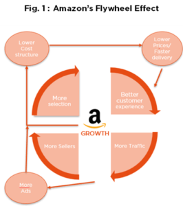 Questo estratto dal libro “Good to Great” di Jim Collins offre una descrizione vivida del processo: “Ogni giro del volano si basa sul lavoro svolto in precedenza, moltiplicandone l’investimento di energie. Mille volte più veloce, poi diecimila, poi centomila. L’enorme e pesante disco vola in avanti, con uno slancio quasi inarrestabile”. In termini più operativi/finanziari, la lettera agli azionisti di Amazon del 2001 recitava quanto segue: “Se facciamo bene il nostro lavoro, i clienti di oggi compreranno di più domani, aggiungeremo altri clienti nel processo e tutto ciò si tradurrà in un maggiore flusso di cassa e in un maggiore valore a lungo termine per i nostri azionisti”.