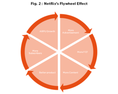 Passiamo ora all’effetto volano di Netflix. Il diagramma appare leggermente diverso, ma il processo è lo stesso: i diversi componenti si alimentano a vicenda per far progredire l’attività. I contenuti, ovviamente, sono al centro del modello di business di Netflix. Man mano che questi contenuti migliorano, in quantità e qualità (segmento in basso a sinistra del diagramma che segue), il ricavo medio per utente (ARPU) aumenta e il numero di abbonati si amplia. Ciò si traduce in una maggiore generazione di flussi di cassa e di pubblicità, che a sua volta rafforza l’effetto leva di Netflix sui competitor e sui creatori di contenuti… migliorando ulteriormente i contenuti. Anche in questo caso, la ruota è in movimento e guadagna velocità a ogni giro.