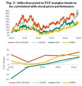 Poi c’è l’importantissima metrica CAC, che sta per “costo di acquisizione clienti”. Il punto chiave da sottolineare è che il CAC non è lineare nel tempo. Man mano che una piattaforma cresce in termini di dimensioni, il CAC incrementale si riduce. Anche il passaparola è un fattore importante in questo senso, così come l’essere il “primo” a entrare in una categoria (si pensi a Uber, Spotify, ecc.). La spesa in investimenti diventa quindi molto più efficace e i margini di free cash flow diventano positivi. Dal punto di vista di un investitore, non sorprende che questo punto di inflessione nei margini di flusso di free cash tenda a essere correlato all’andamento del prezzo del titolo.