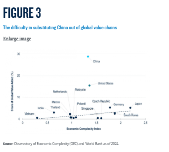 Frustrati dall’esito dell’accordo di fase 1, gli Stati Uniti hanno inizialmente adottato un approccio massimalista volto a garantire una minaccia credibile di disaccoppiamento che spingesse la Cina a cambiare rotta. In una prospettiva più ampia, questa competizione riguarda anche la definizione delle sfere di influenza a lungo termine nel commercio, nell’hardware tecnologico, nell’intelligenza artificiale e nel soft power. La capacità degli Stati Uniti di esercitare un’influenza a lungo termine sulla Cina attraverso il commercio dipende dal successo della sostituzione dei beni e dei componenti cinesi, non solo negli Stati Uniti, ma a livello globale (Figura 3). Qui sta la difficoltà, dato che la Cina è l’unico Paese in grado di aggiungere valore alla produzione in tutto lo spettro del commercio globale.