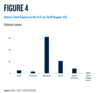 La tariffa media sulla Cina potrebbe salire all’80% in uno scenario in cui gli Stati Uniti mantenessero dazi del 20% sul fentanil e del 10% sui prodotti di largo consumo, abolissero le esenzioni sui microchip, applicassero un dazio del 25% su tutti i settori attualmente oggetto di indagini ai sensi della Sezione 232 e un dazio “reciproco” aggiuntivo del 10% su tutti i settori non contemplati dalle indagini in questione (cfr. figura 4 per la ripartizione dei dazi per settore).