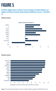 Gli esportatori europei e asiatici sono sempre più legati e in diretta concorrenza con i prodotti cinesi sui mercati globali. Come mostrano i dati commerciali dell’aprile 2025 riportati nella parte superiore della figura 5, i loro mercati interni sono particolarmente esposti al rischio di essere invasi dai prodotti cinesi. Sebbene difficile da controllare, la Cina mostrerà probabilmente una certa sensibilità alle percezioni globali sul dumping, data la percezione di essere vista come esportatrice di disinflazione (parte inferiore della figura 5).