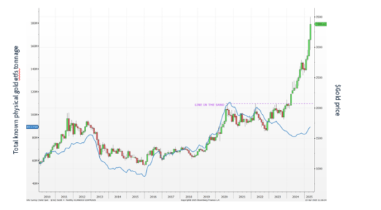 Il prezzo dell’oro in dollari è cresciuto mentre il tonnellaggio dell’ETF in oro fisico (la linea blu) è del 25% inferiore al picco del 2020. Lo SPDR Gold Trust ha scambiato100 tonnellate l’anno scorso.
