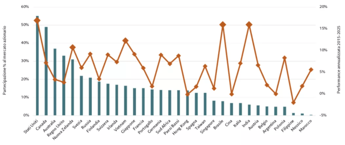 Un aspetto spesso sottovalutato dei mercati emergenti è la loro straordinaria capacità di performance nel lungo termine. Se consideriamo un orizzonte temporale di vent’anni, dal 2005 al 2025, tra le cinque borse mondiali più performanti, tre sono mercati emergenti. Questo risultato mette in luce il potenziale di crescita e di rendimento offerto da queste economie in rapida evoluzione. Inoltre, va sottolineato che la penetrazione locale degli investitori nei mercati azionari è attualmente inferiore al 10%, suggerendo un ampio margine di crescita nel medio-lungo periodo.