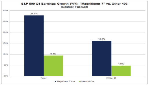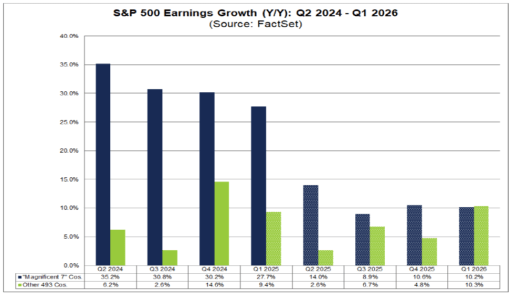 Gli analisti prevedono ora un rallentamento nella crescita degli utili per le aziende delle “Magnifiche 7” rispettivamente del 14,0%, 9% e 10% per i prossimi trimestri, accompagnato invece da una accelerazione nella crescita da parte delle altre 493 società.