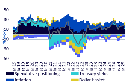 Il tasso di cambio del dollaro statunitense è un fattore chiave del comportamento del prezzo dell’oro in termini di dollari. Il nostro modello proprietario per l’oro mostra che l’apprezzamento del dollaro nel periodo 2021-2022 ha pesato significativamente sulla performance dell’oro. Al contrario, il deprezzamento del dollaro nel 2023 ha contribuito positivamente ai prezzi dell’oro. Più di recente, nel marzo e nell’aprile 2025, la rinnovata debolezza del dollaro ha nuovamente sostenuto i guadagni dell’oro.