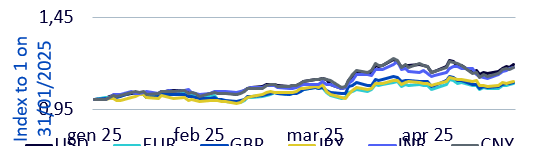 Il paniere del dollaro USA si è apprezzato significativamente tra maggio 2021 e settembre 2022, con un aumento del 25% grazie al ciclo di inasprimento monetario globale guidato dalla Federal Reserve (Fed). Tuttavia, dal settembre 2022 all’ottobre 2024, il dollaro si è per lo più deprezzato, scendendo di circa il 10%. È seguito un forte rimbalzo, con il dollaro che ha guadagnato il 10% tra ottobre 2024 e gennaio 2025. Questa impennata è stata determinata dalla percezione che l’economia statunitense fosse più solida rispetto alle altre, riducendo le aspettative di un imminente allentamento monetario da parte della Fed e sostenendo la forza del dollaro.