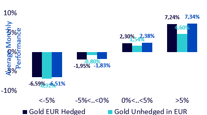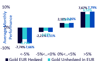In termini di euro, dal 2004, durante i mesi in cui i prezzi dell’oro sono saliti di oltre il 5%, l’esposizione all’oro in euro senza copertura è aumentata in media del 6,53%: