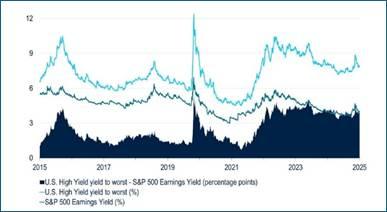 Figura 3 – Il divario tra i rendimenti dell’HY statunitense e il rendimento degli utili dell’S&P 500 si è ampliato al 78°percentile, sottolineando l’attrattiva dell’HY rispetto alle azioni.