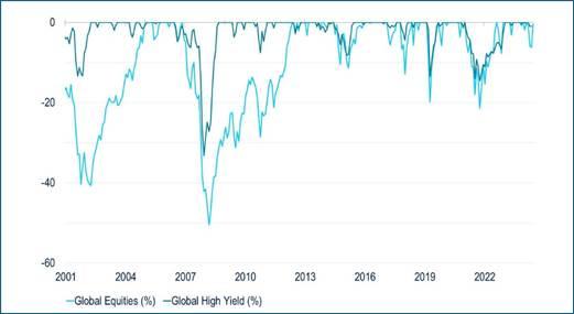 Fonte: l’HY è rappresentato dall’indice ICE BofA Developed Markets High Yield e le azioni dall’indice MSCI World (USD Hedged). La nostra analisi include cali del 10% o superiori. I cali analizzati includono il periodo 2001-2005, 2007-2013, 2015-2016, 2018-2019, 2020, 2022-2023.