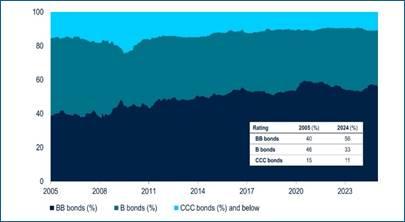 Inoltre, il profilo di qualità del mercato high yield rimane su un percorso di miglioramento secolare. Con l’aumento del segmento di fascia alta del mercato high yield con rating BB dal 40% circa prima della crisi finanziaria globale all’attuale 55%, la quota dei segmenti con rating B e CCC è diminuita, determinando un significativo miglioramento della qualità creditizia media del mercato.