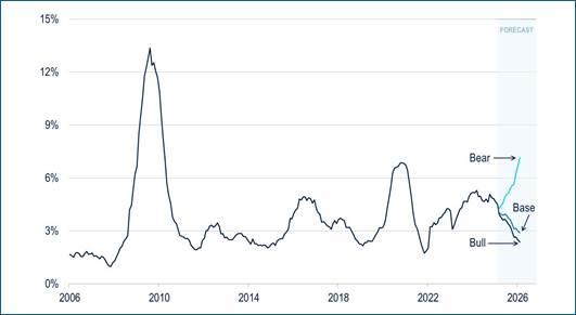 Il dibattito sugli indicatori di credito nel settore della leveraged finance verte inevitabilmente sui default e, dopo un 2024 positivo, prevediamo un ulteriore calo dei default globali nel 2025 e nel 2026. La Figura 6 si basa sul tasso di insolvenza ponderato per gli emittenti, che è superiore al tasso di insolvenza ponderato per il valore nominale spesso citato, in quanto esclude gli scambi di gestione del passivo che hanno mantenuto il tasso di insolvenza ponderato per il valore nominale vicino ai livelli storicamente bassi. Le nostre previsioni di default nello scenario base e in quello ottimistico indicano una riduzione di oltre 50 punti base del tasso di default fino al 2026, in linea con le condizioni di default storicamente basse degli ultimi anni. Nello scenario pessimistico, prevediamo un aumento di 200 punti base dei default nel prossimo anno.