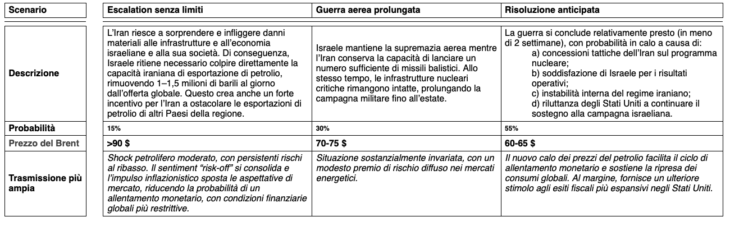 Sebbene l’evento di questa settimana non fosse di per sé inatteso, il suo tempismo lo è stato e, grazie a un’abile operazione di copertura, i mercati (e i leader iraniani) sono stati inizialmente scossi dalla notizia di venerdì. Alcuni giorni di scontri aerei reciproci hanno rassicurato i mercati sul fatto che il settore energetico globale resterà in gran parte indenne. Da quando sono iniziati i raid aerei, il Brent è salito di circa il 6%, ma rimane sostanzialmente invariato da inizio anno. Si tratta di un premio di rischio limitato, considerando che circa un quinto degli idrocarburi mondiali transita dallo Stretto di Hormuz. Nel complesso condividiamo questa valutazione, pur non ritenendo che i rischi siano diminuiti da venerdì.