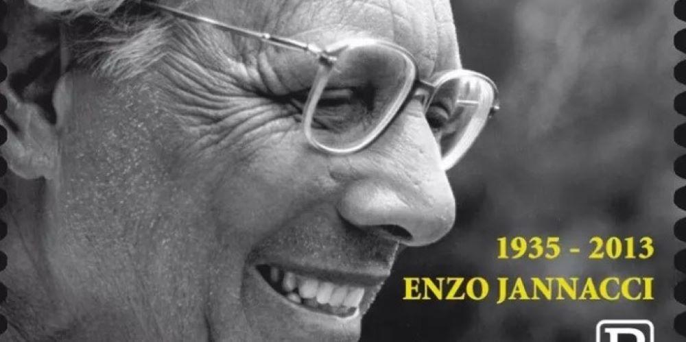 Un piccolo rettangolo d’inchiostro che racchiude mezzo secolo di poesia in vernacolo e malinconia surreale, quella di chi sapeva raccontare “gli ultimi” senza retorica, ma con un’ironia tagliente e una delicatezza che oggi mancano a tutti noi. Sulla vignetta postale campeggia l’immagine tratta dalla copertina del suo diciottesimo album, L’uomo a metà (2003): lo sguardo obliquo, la cravatta storta, il sorriso che sa di tragedia e comicità insieme. Enzo “Faceva il palo nella banda dell’Ortica”, ma anche il cardiochirurgo.