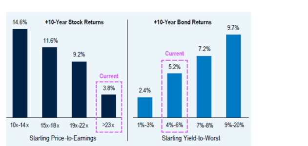 Come mostra il grafico, quando i rendimenti obbligazionari sono compresi tra il 4% e il 6% e le valutazioni azionarie sono elevate (rapporti prezzo/utili superiori a 23), le obbligazioni mostrano una propensione storica a sovraperformare le azioni nel decennio successivo.