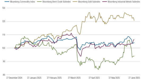 Fonte: Bloomberg e PIMCO al 27 giugno 2025. Crescita di 100 dollari basata sui rendimenti giornalieri dell’indice Bloomberg Commodity, del sottoindice Bloomberg Brent Crude, del sottoindice Bloomberg Gold e del sottoindice Bloomberg Industrial Metals. I rendimenti passati non sono una garanzia né un indicatore affidabile dei risultati futuri.