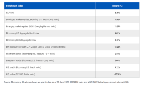 Per contestualizzare, la Tabella 1 evidenzia le performance di alcuni dei principali benchmark nel 2025 fino a giugno: