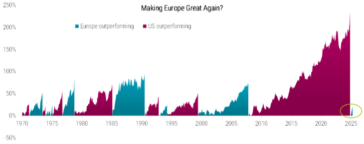 Fonte: Robeco, LSEG, MSCI. Il grafico mostra la performance relativa dell’indice MSCI USA rispetto all’indice MSCI Europe. Un nuovo ciclo inizia dopo il picco del mercato che ha sovraperformato in precedenza, una volta che il mercato che ha sottoperformato in precedenza ha sovraperformato di almeno il 20% rispetto al minimo precedente. La performance si basa sugli indici di rendimento totale di fine mese in USD. Il periodo campione va da gennaio 1970 ad aprile 2025. Questo grafico ha solo scopo illustrativo e non rappresenta un particolare prodotto o strategia di investimento.