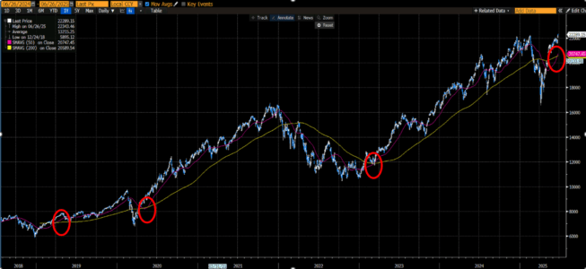 Una fragile tregua tra Israele e Iran ha favorito il calo delle materie prime e dei rendimenti obbligazionari, mentre i mercati azionari hanno accelerato verso la fine del trimestre e per la prima volta da inizio febbraio, gli indici si trovano sui massimi e gli amanti dell’analisi tecnica festeggiano un nuovo “golden cross” (l’incrocio tra la media mobile a 50 e 200 giorni).
