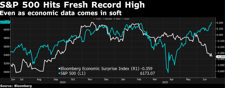 Ma questa settimana il catalizzatore principale è stato un altro ovvero la fine – almeno formale – della cosiddetta “guerra dei 12 giorni” tra Iran e Israele. Trump ha dichiarato la tregua, anche se gli scambi di accuse e tensioni tra i due paesi non si sono del tutto placati. Il mercato ha comunque reagito in modo positivo con l’S&P 500 che si è riportato sui massimi storici, aiutato anche dal brusco calo del prezzo del petrolio, sceso sotto quota 66 dollari.