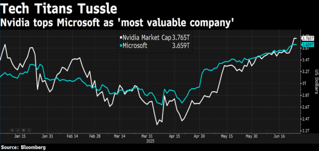 Il titolo Nvidia ha toccato questa settimana nuovi massimi, per la prima volta da gennaio. L’attuale capitalizzazione di mercato di Nvidia è di 3,8 trilioni di dollari, parliamo dell’azienda di maggior valore al mondo, che supera Microsoft e Apple.