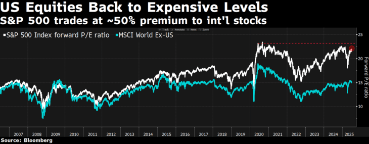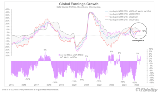 E lo stesso discorso vale per le small cap e per l’azionario globale rispetto a quello USA. Nel frattempo, la crescita degli utili al di fuori degli Stati Uniti continua a convergere verso una crescita generalizzata dell`8% praticamente per tutte le economie globali.