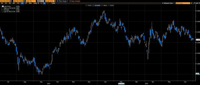 Powell ha espresso preoccupazione per il possibile effetto inflattivo dei dazi voluti dall’amministrazione Trump, ma per ora si tratta più di un’allerta teorica che di un orientamento operativo. La Fed mantiene un atteggiamento prudente, anche alla luce di dati occupazionali che indicano un rallentamento moderato, ma non allarmante ed un PCE che si mantiene leggermente al di sopra delle attese. Intanto, il rendimento del Treasury decennale è sceso al 4,25%, riflettendo il crescente scetticismo sulla reale resilienza dell’economia. Il movimento al ribasso è iniziato dopo la revisione del PIL reale del primo trimestre, corretta da -0,2% a -0,5%.