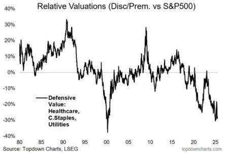 Le migliori opportunità si stanno spostando, silenziosamente, fuori dal perimetro tradizionale dell’eccezionalismo americano. È in questo contesto che diventano interessanti i settori difensivi, che certamente non sono caratterizzati dalle iper-crescite del settore tech, ma che sono ad oggi sottovalutati e totalmente snobbati dagli investitori con le valutazioni relative dei settori difensivi oggi sui minimi storici ed a livelli visti solo nella bolla tech del 2000.