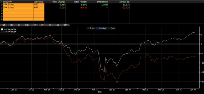 Giugno è stato un mese molto positivo per l’azionario USA, con performance a doppia cifra per il Nasdaq che ha chiuso il mese in rialzo del 6.5%, con anche l’S&P 500 che ha guadagnato il +5%. Gli indici Americani si trovano ora sui massimi storici, ma se si guarda all’intero semestre, il rialzo è di poco superiore al 5%, segno che gran parte della performance è stata concentrata negli ultimi due mesi, dopo il minimo toccato ad aprile. La storia cambia drasticamente, se le stesse performance vengono misurate in Euro invece che in dollari. Nel corso degli ultimi mesi, il dollaro americano ha infatti perso ben oltre il 10% contro le principali valute, e la performance da inizio anno dell’S&P 500 misurata in euro sarebbe del -6.5%.
