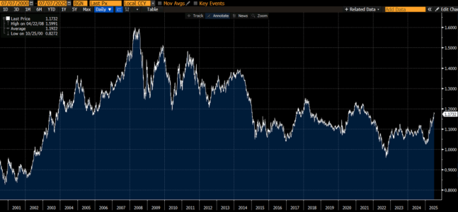 Il deprezzamento del dollaro, uno degli obiettivi dichiarati dell’amministrazione Trump, è stato perseguito anche attraverso le pressioni su Powell per abbassare i tassi ventilando la possibilità di scegliere in anticipo il prossimo presidente della FED che possa già influenzare le aspettative sui tassi prima dell’inizio del suo mandato a maggio 2026. Il cambio euro/dollaro si è riportato oggi praticamente sulla media degli ultimi 25 anni, ma la rapidità del suo movimento ha sorpreso molti.