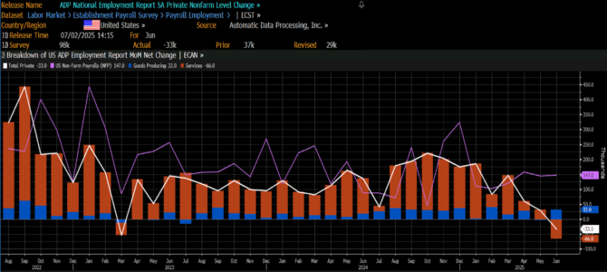 Venendo ora ai dati macro, le rilevazioni più recenti appaiono contrastanti. Il report ADP sull’occupazione ha deluso pesantemente con una perdita netta di 33.000 posti di lavoro nel privato, a fronte di attese di +100.000, con anche il dato di maggio che è stato inoltre rivisto al ribasso.