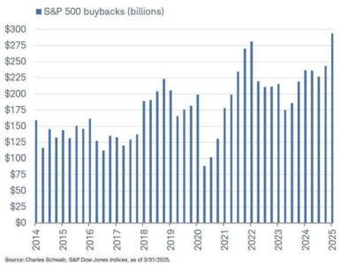 L’altro record di quest’anno, che sicuramente sta aiutando la salita degli equity, riguarda i buy back da parte delle aziende americane, probabilmente dovuto anche al fatto che molte aziende di fronte ad uno scenario di maggiore incertezza legato ai dazi hanno preferito fare scelte di allocazione del capitale più mirate verso il riacquisto di azioni proprie approfittando anche del calo dei prezzi registrato tra febbraio ed inizio aprile.