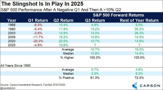 Ci troviamo in una fase piuttosto rara per i mercati: nella storia americana, quando il primo trimestre è stato negativo e il secondo ha chiuso con un rialzo superiore al 10%, i trimestri successivi sono stati sempre positivi, con rendimenti sopra la media storica.