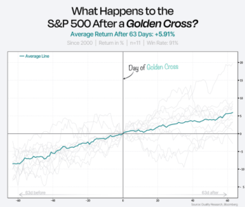 Questo pattern si allinea anche ad altre statistiche che mostrano come la rottura di nuovi massimi da parte degli indici tenda spesso a generare ulteriori rialzi, confermando il detto “nuovi massimi richiamano nuovi massimi”, oppure le statistiche che vedono la continuazione del mercato rialzista in seguito al così detto golden cross, uno degli incroci tra medie mobili più seguito dal mercato che si è appena verificato sull’S&P500.