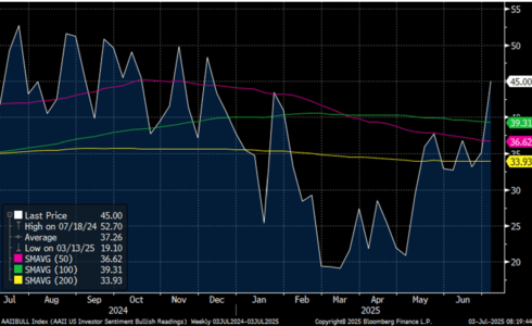 Il fatto che il mercato si trovi sui massimi non implica automaticamente un’imminente correzione, così come non possiamo escludere che le valutazioni possano spingersi ancora più in alto. Tuttavia, è opportuno aumentare progressivamente il livello di cautela man mano che il contesto si fa più euforico, pur riconoscendo che, al momento, non siamo ancora in una fase di eccesso conclamato. Se prendiamo ad esempio il rapporto bull/bear ratio come indicatore di sentiment, i rialzisti sono oggi in salita e si trovano sui massimi dell’anno al 45% rispetto al 35% precedente, ma non siamo ancora in aree di eccesso di ottimismo.