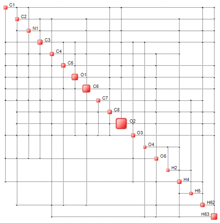 Nella figura sotto è illustrata una Mappa di Complessità di una piccola molecola, generata dall’Intuizione Artificiale, dove si notano gli atomi dominanti, rappresentati dai quadrati più grandi, che sono responsabili del comportamento biologico della molecola in questione.