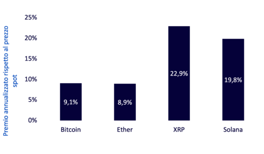- Il bitcoin definisce lo standard istituzionale: i future su bitcoin del CME rimangono i derivati su criptovalute più profondi e liquidi, con un open interest dominante tra gli investitori istituzionali. Sono scambiati costantemente a un premio annualizzato rispetto al prezzo spot, rappresentando così lo strumento più efficiente e scalabile per ottenere rendimento dal basis.