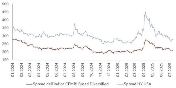 Se a tutto questo aggiungiamo le aspettative di un indebolimento del dollaro, minato dai dazi statunitensi, non sorprende come alcuni economisti suggeriscano di aumentare l’allocazione nelle obbligazioni societarie dei mercati emergenti. Quest’opportunità non comporta necessariamente un rischio più elevato. Ad esempio, l’aumento della domanda da parte degli investitori locali, dovuta alla crescita della disponibilità di risparmi, ha reso relativamente stabile il credito societario dei mercati emergenti nel corso delle turbolenze di mercato seguite al “Liberation Day”. Gli spread rispetto ai Treasury USA sono aumentati di soli 55 punti base nella prima settimana di aprile, rispetto ai 120 punti base degli high yield statunitensi.