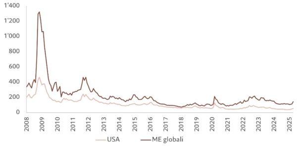 Fonte: LSEG, Pictet Asset Management. Dati relativi al periodo dal 31/01/2008 al 30/04/2025.