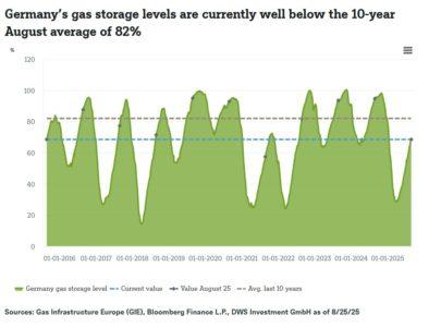 Per l’economia, lo stoccaggio del gas è più di un semplice indicatore tecnico: è un cuscinetto contro gli shock. Scorte ridotte aumentano il rischio di impennate dei prezzi durante le ondate di freddo, che potrebbero mettere sotto pressione sia le famiglie sia le industrie ad alta intensità energetica. “I costi energetici più elevati alimentano l’inflazione, complicano la politica monetaria e pesano sulla crescita – tuttavia, ci aspettiamo che i prezzi del gas naturale continuino a scendere al di sotto dei 25 euro/MWh, non per un ritorno delle forniture russe via gasdotto, bensì per premi di rischio molto più bassi. Riforme nel settore energetico potrebbero ridurre ulteriormente i prezzi dell’energia”, afferma Martin Moryson, Global Head of Economics di DWS. Questo potrebbe sostenere la produzione industriale tedesca, anche se non tutta la produzione industriale ad alta intensità energetica tornerà.