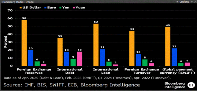 Questo cambiamento non è di poco conto perché altera una relazione durata 80 anni, che finora nessuno aveva mai messo in discussione e che porta ad avere un peso del dollaro vicino al 60% nella torta globale delle riserve, del 50% lato commercio mondiale, del 45% lato negoziazioni su valute. Una sorta di “do ut des”. Che è in procinto di cambiare.