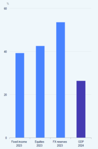 Fonte: SIFMA, Macrobond al giugno 2025; le quote di reddito fisso, azioni e riserve in valuta estera sono al 2023.