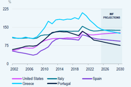 Il deterioramento delle condizioni fiscali negli Stati Uniti sta inoltre generando maggiori preoccupazioni rispetto a quelle dell’area euro, in particolare in uno scenario di rallentamento economico. Il punto di partenza del rapporto debito/PIL e del disavanzo è significativamente più elevato negli Stati Uniti che nell’area euro (si veda il riquadro seguente sulle prospettive fiscali degli Stati Uniti), sottolineando la pressione relativa alla base delle curve dei rendimenti di alcuni mercati sviluppati. La maggior parte dell’area dell’euro, ad eccezione della Francia, è credibilmente sulla buona strada per raggiungere un disavanzo del 3% in linea con le regole di bilancio dell’UE. Tale obiettivo funge anche da soglia di riferimento da monitorare in base all’evoluzione delle condizioni economiche e di bilancio. I paesi che in passato erano considerati punti critici, come il Portogallo, hanno migliorato significativamente la sostenibilità delle finanze pubbliche negli ultimi anni. Per contro, il rapporto tra il debito pubblico e il PIL degli Stati Uniti è destinato a superare quello della Grecia (figura 2).