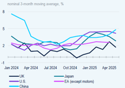 Tuttavia, il sostegno governativo rivolto ai consumatori, come gli incentivi alla permuta e gli sconti sull’e-commerce, ha fornito un sostegno economico. La tregua commerciale di Ginevra ha offerto un’altra spinta a breve termine all’economia, anche se la produzione industriale e gli investimenti in beni immobili rimangono deboli. Questa debolezza riflette senza dubbio le nuove barriere commerciali erette non solo dagli Stati Uniti attraverso l’aumento dei dazi, ma anche dall’UE, che ha recentemente istituito una task force per la sorveglianza delle importazioni al fine di monitorare le tendenze potenzialmente dannose. Oltre al sostegno fiscale mirato ai consumatori, la Cina sta beneficiando anche dell’allentamento monetario. L’inflazione rimane sotto lo zero e nemmeno la recente volatilità dei prezzi del petrolio è sufficiente a superare la deflazione. Di conseguenza, prevediamo un ulteriore allentamento nella seconda metà del 2025.