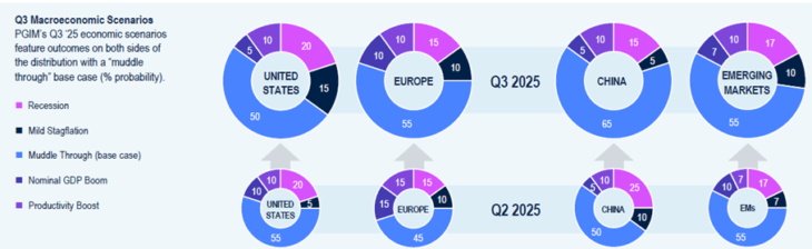 Gli scenari economici di PGIM per il terzo trimestre del 2025 presentano risultati su entrambi i lati della distribuzione con uno scenario base di tipo “muddle through” (probabilità in %).