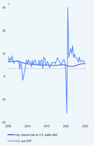 Figura 4: Crescita del PIL nominale degli Stati Uniti rispetto al tasso di interesse medio sul debito pubblico USA