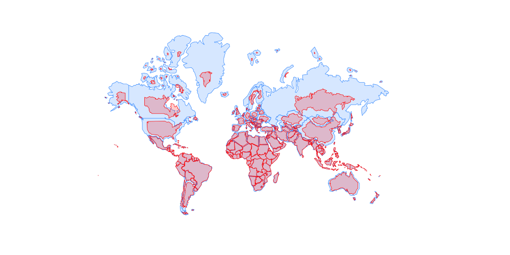 In rosso le proporzioni reali di Equal Earth, in azzurro le dimensioni sballate della proiezione di Mercatore